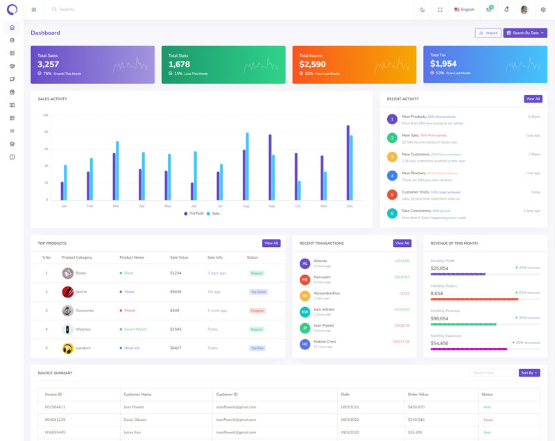 Here, this template is available in the LTR and RTL versions with vertical and horizontal menus and comes with different types of themes. So that users can choose their best theme and customize the template according to their choice.