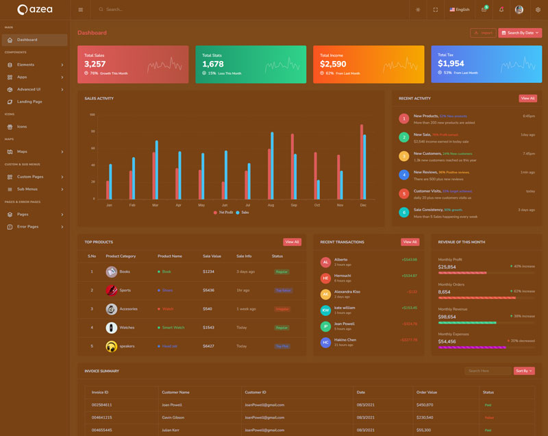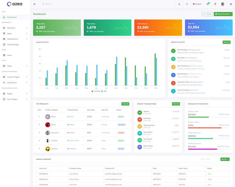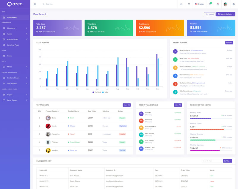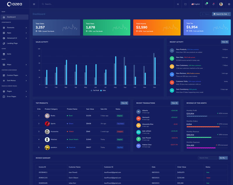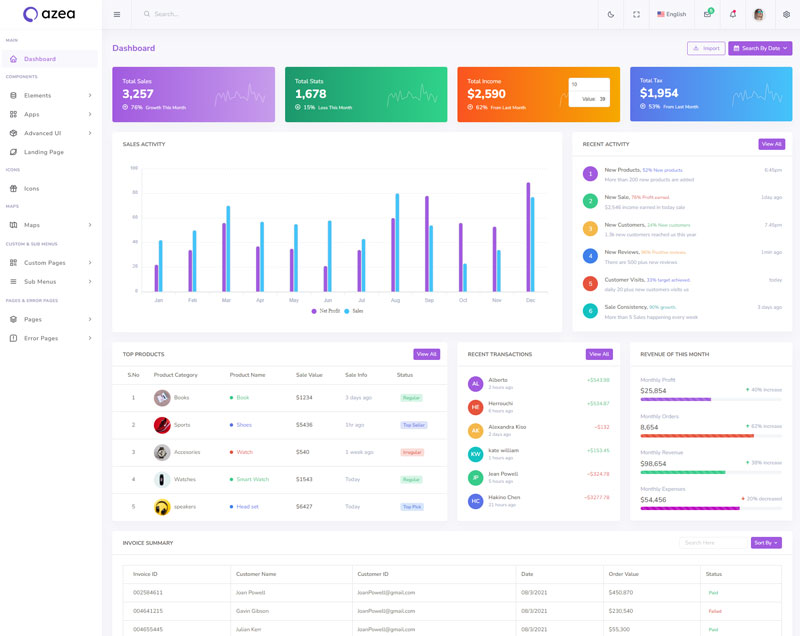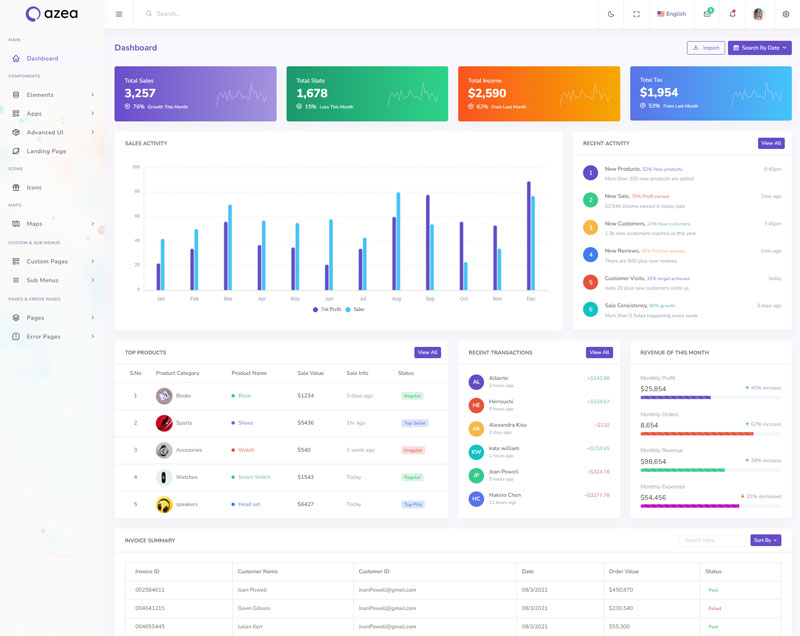 Azea - Premium Bootstrap 5 HTML 5 Admin & Dashboard Template boasts essential features such as design quality, compatibility with your front-end framework, responsiveness, ease of customization, comprehensive documentation, and dedicated support. Additionally, it includes integrated plugins and other supplementary features.