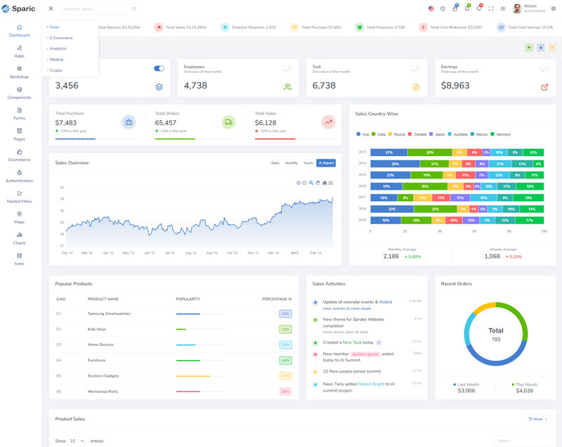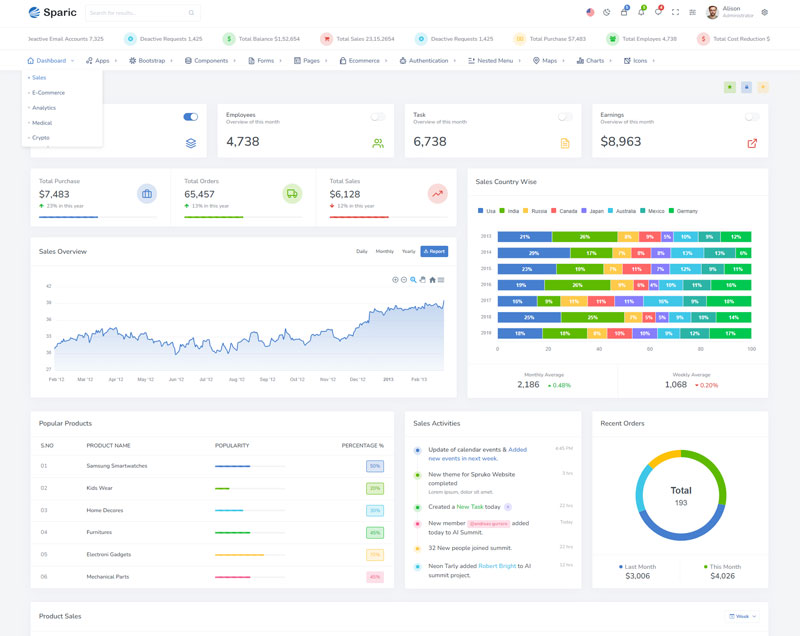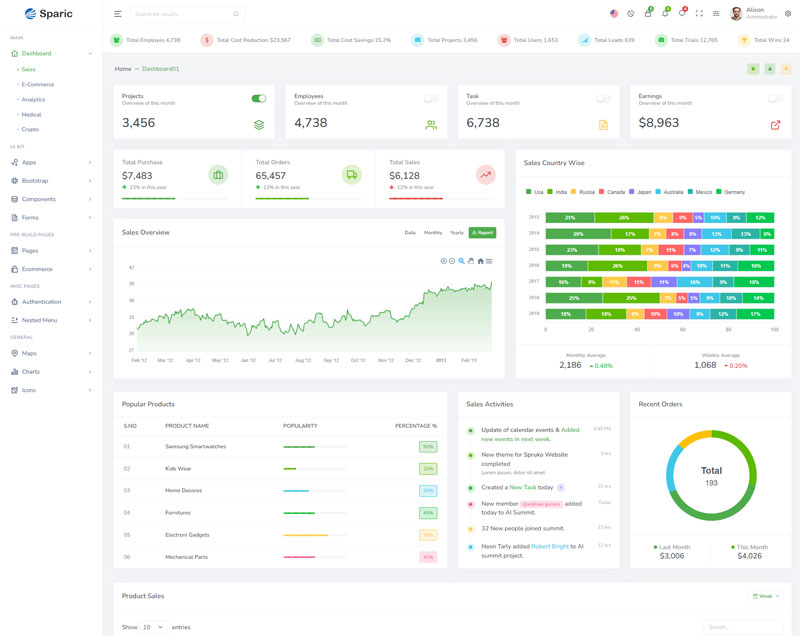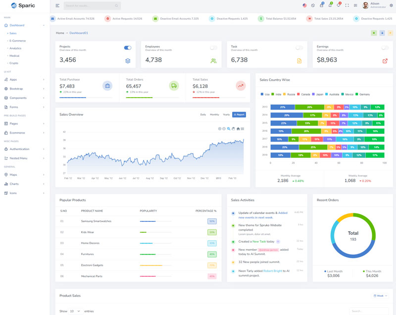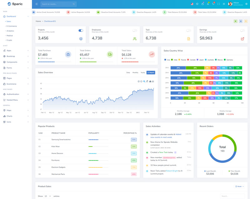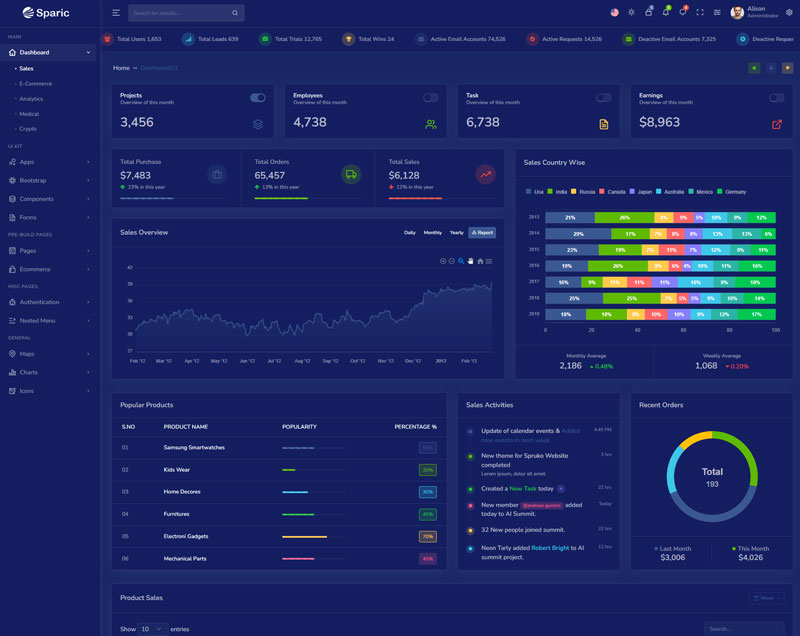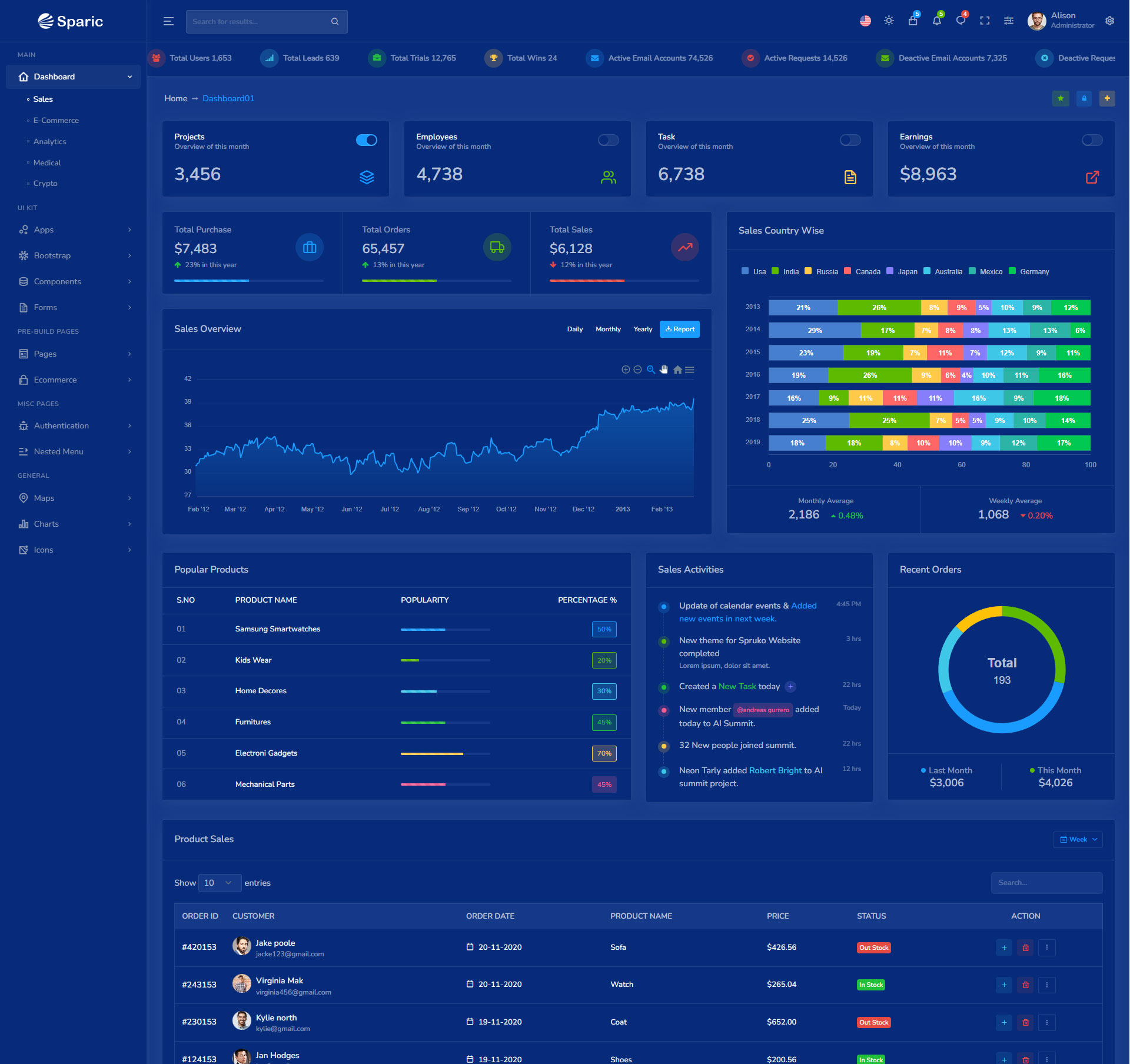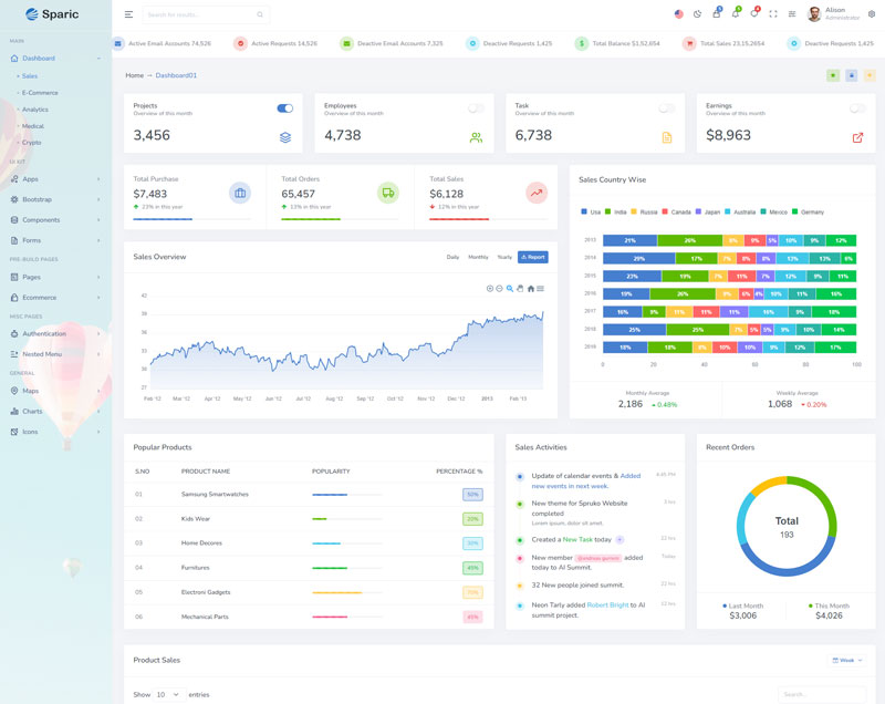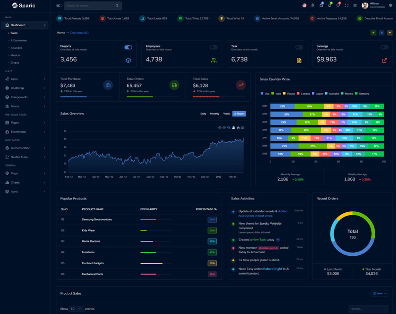 Sparic admin template comes with ready to use features. It has lots of ready-made features saves more time for developers.