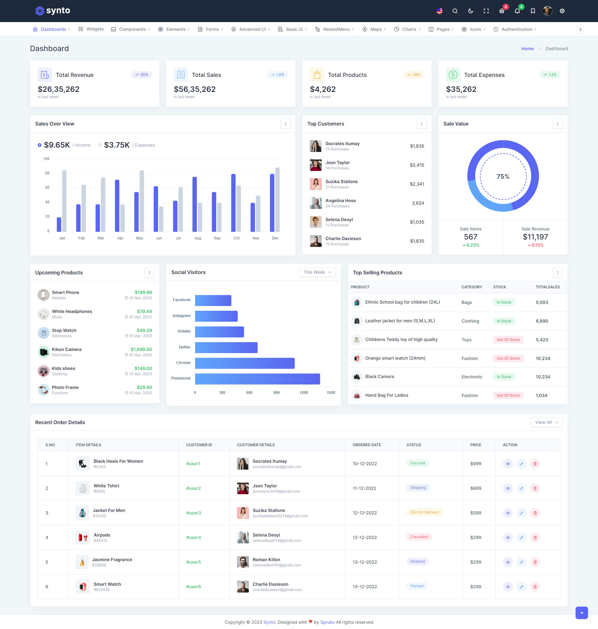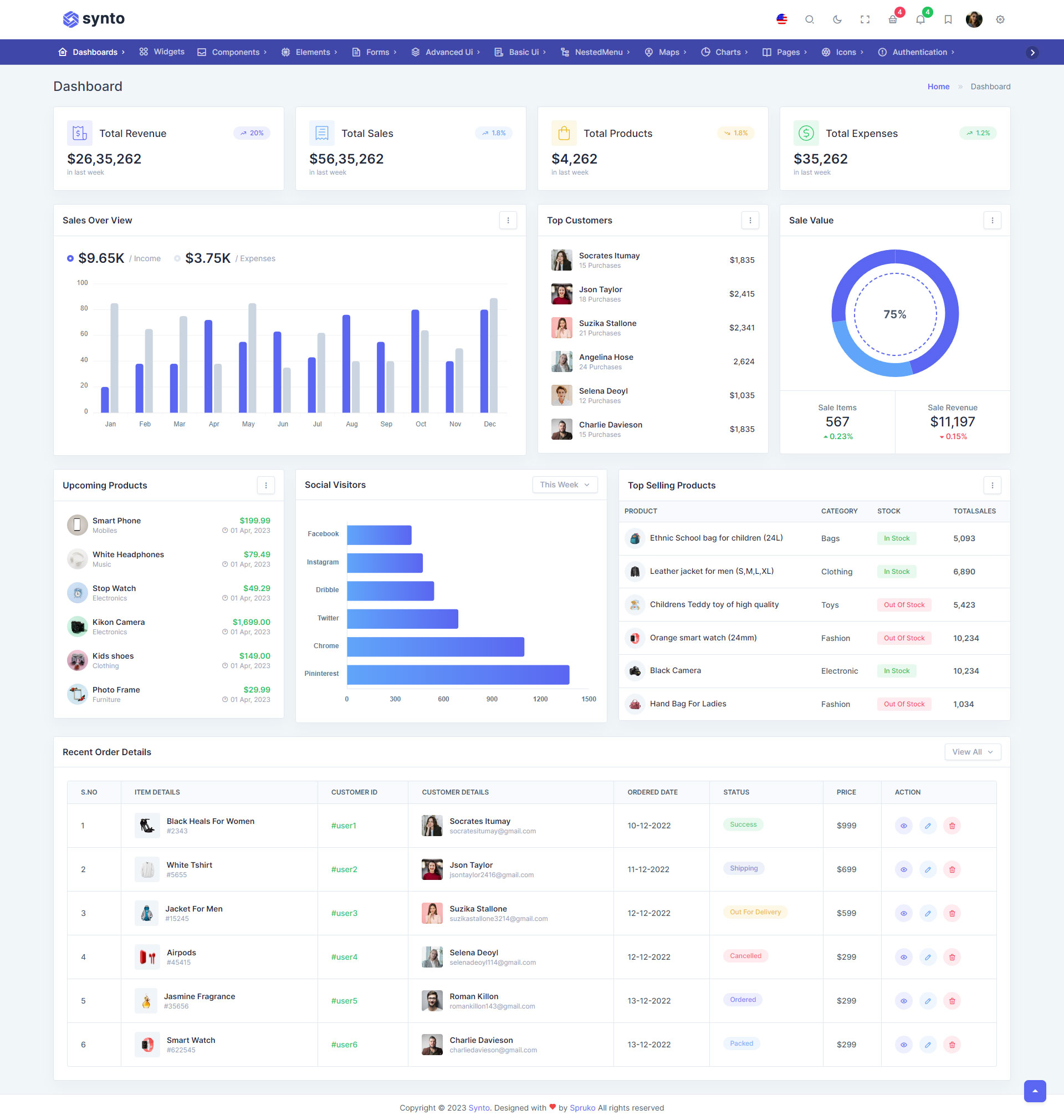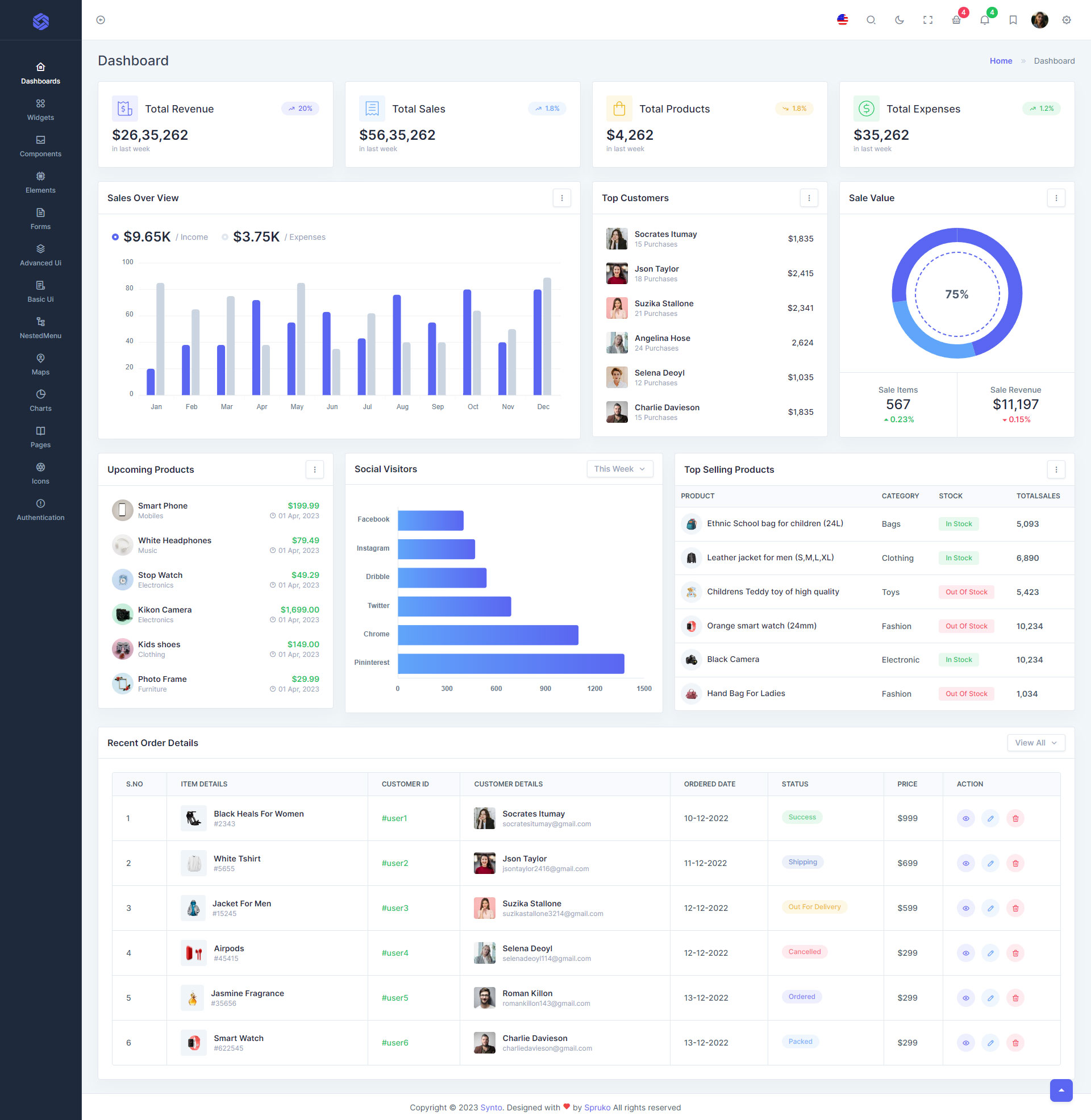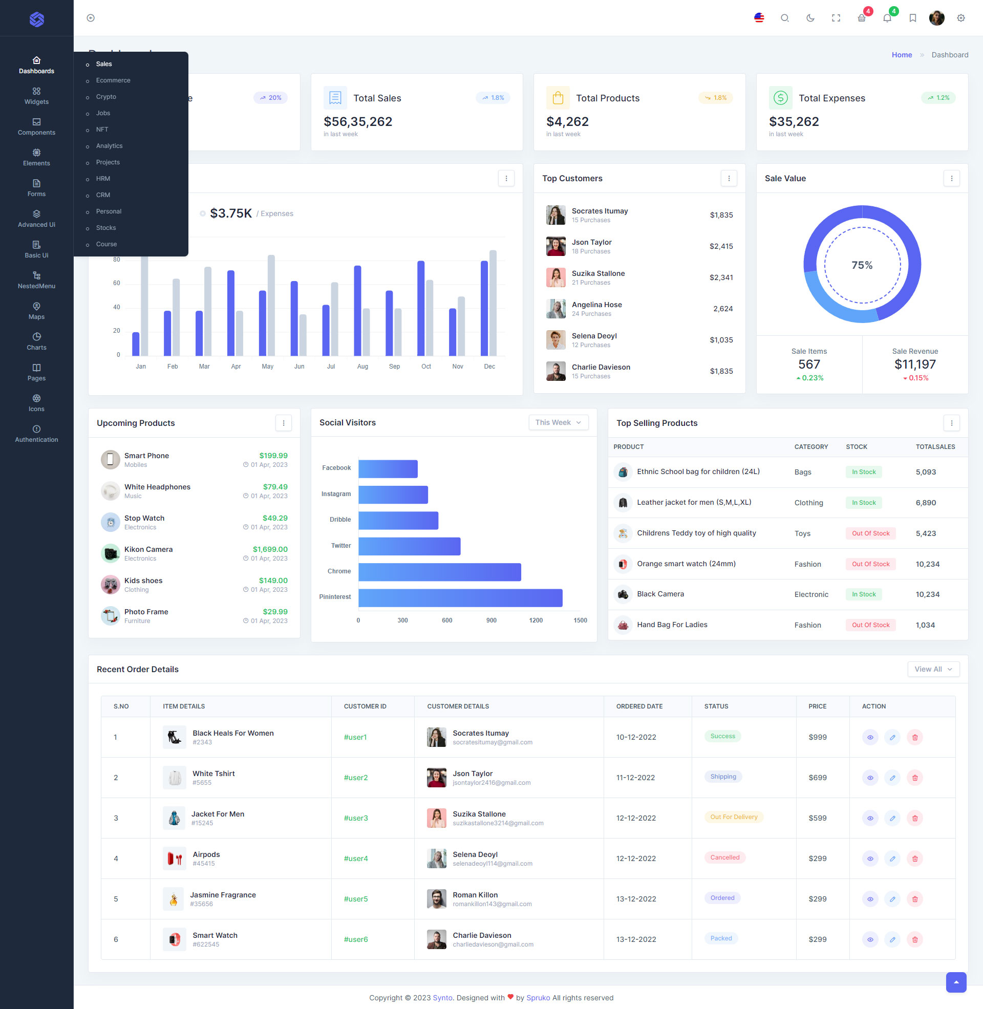This Synto React TypeScript Admin template comes with 12 beautiful dashboards and different types of themes. So that users can choose their best theme and customize the template according to their choice.