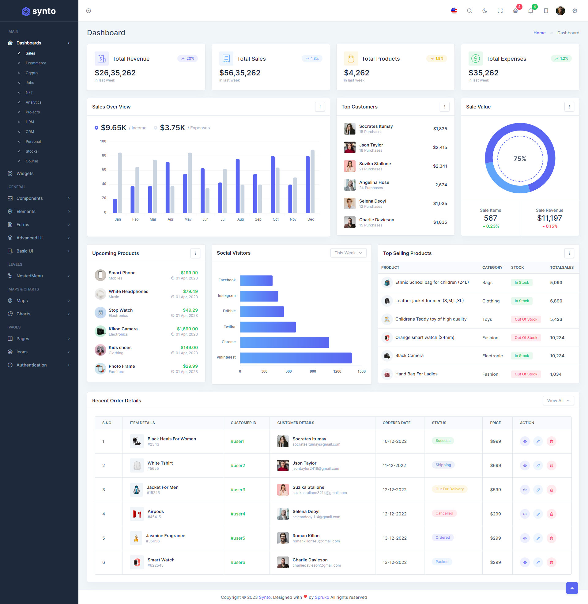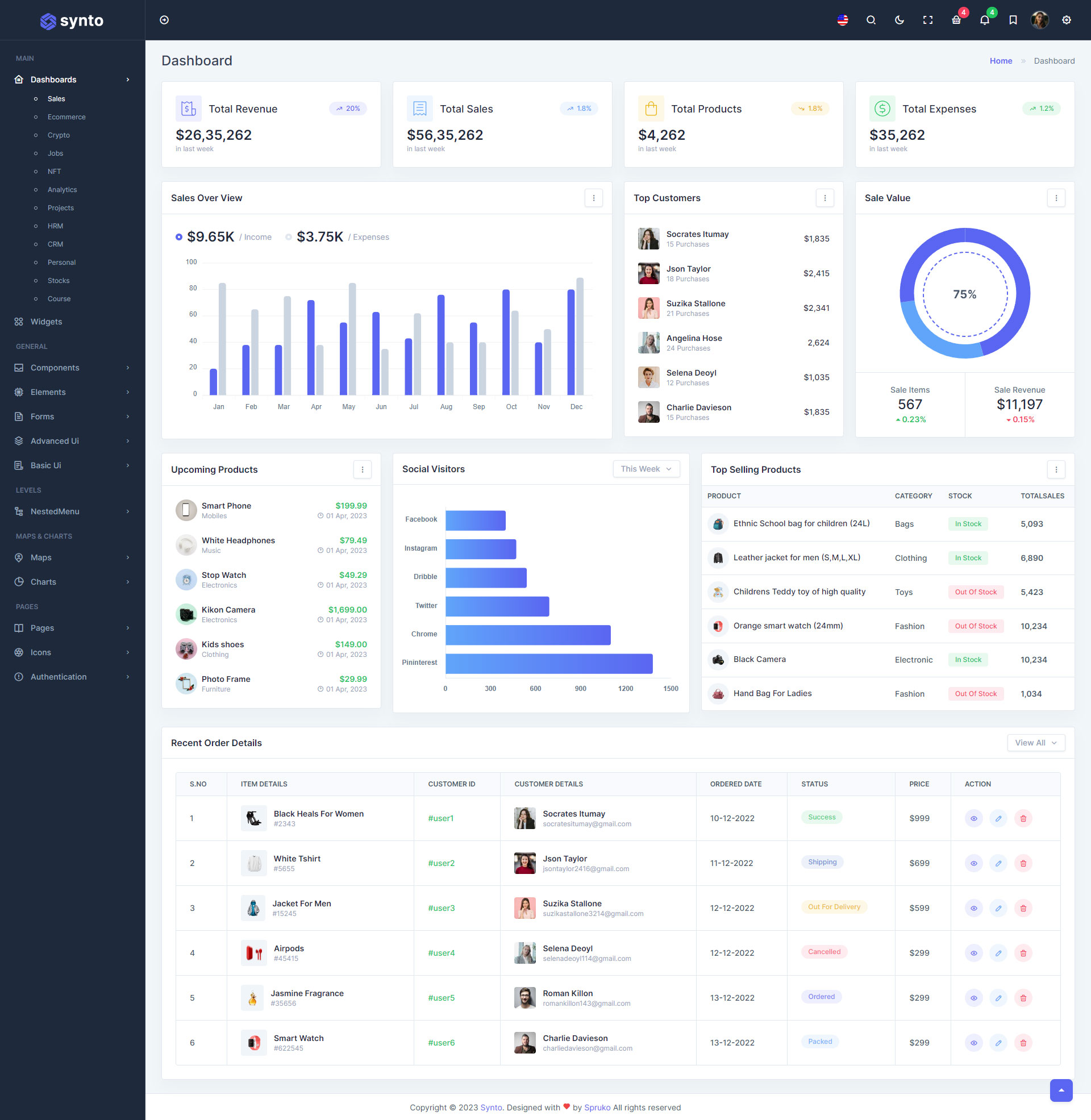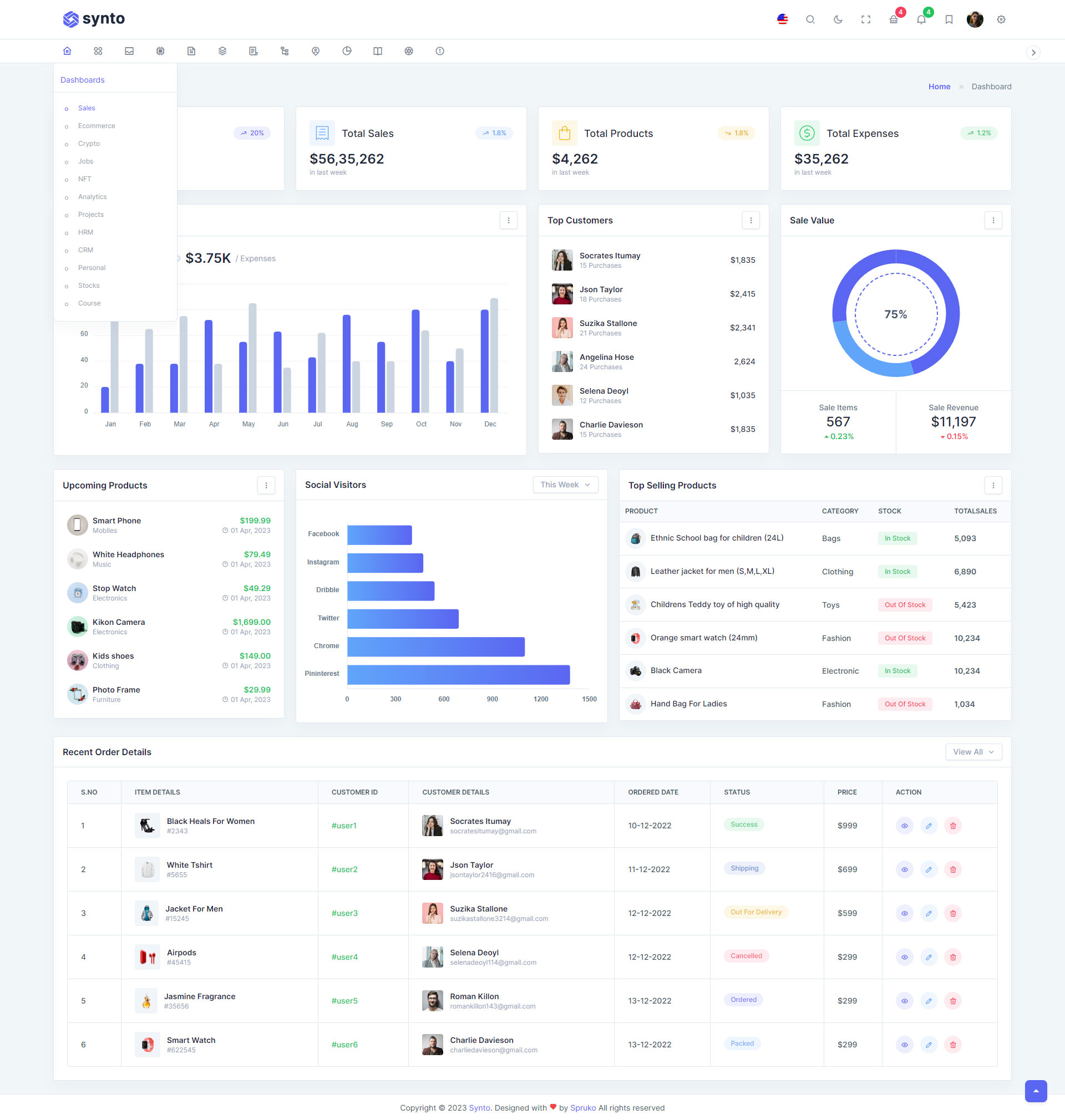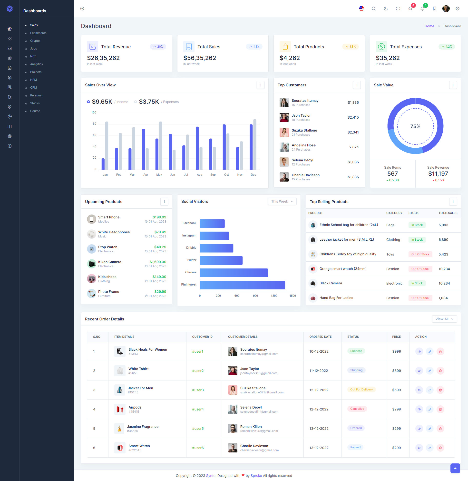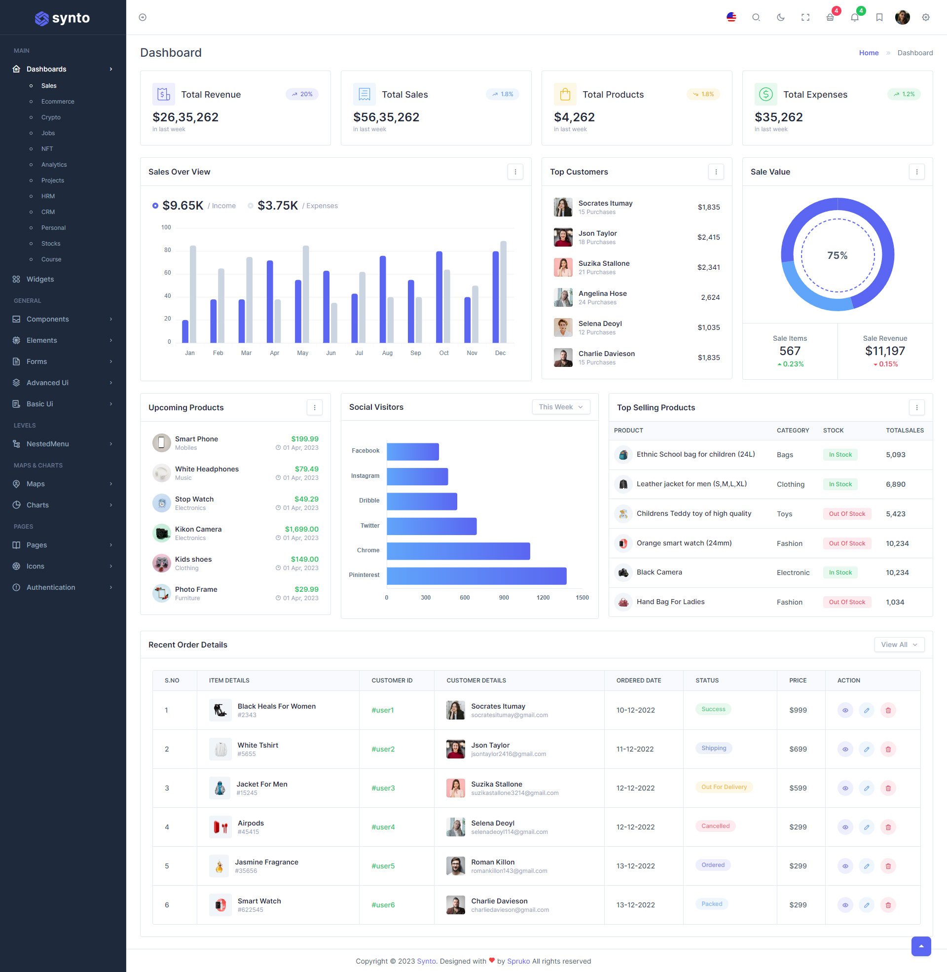 This Synto React TypeScript Admin template comes with 12 beautiful dashboards and different types of themes. So that users can choose their best theme and customize according to their choice.