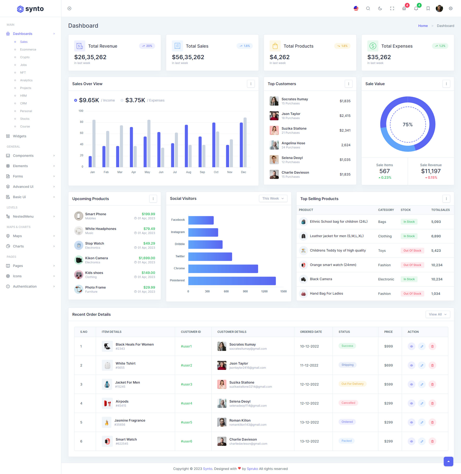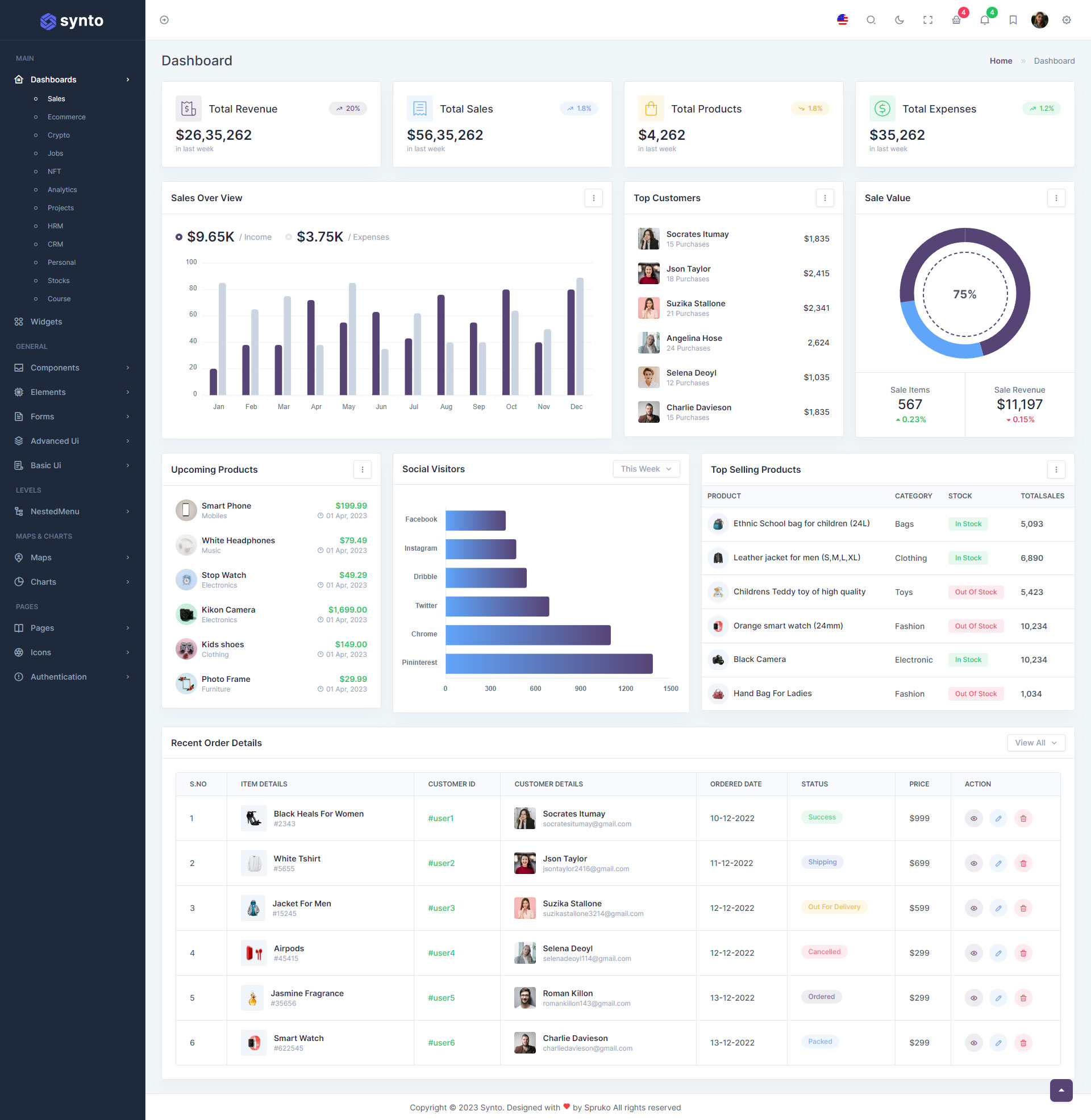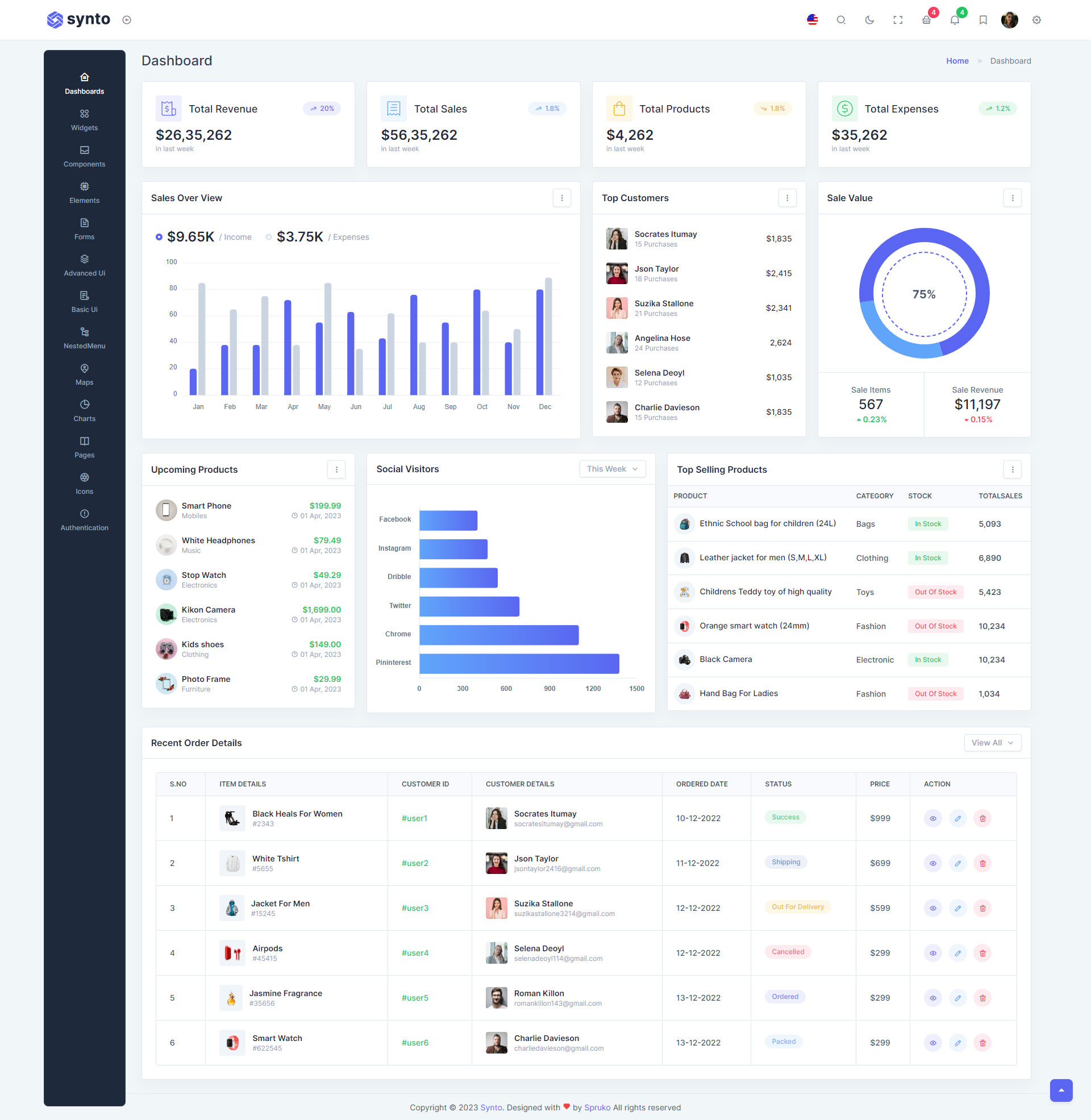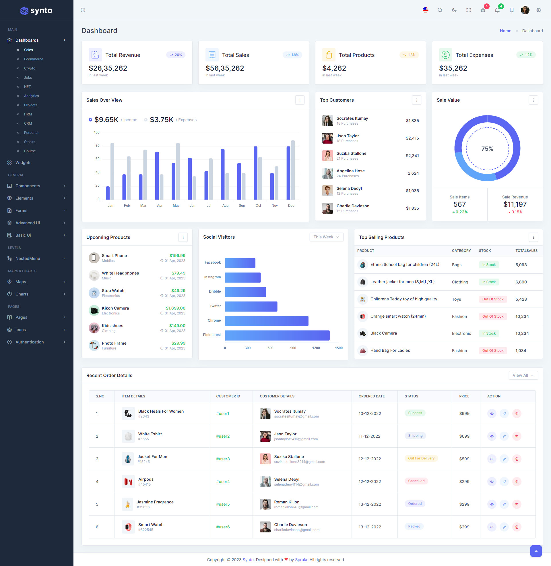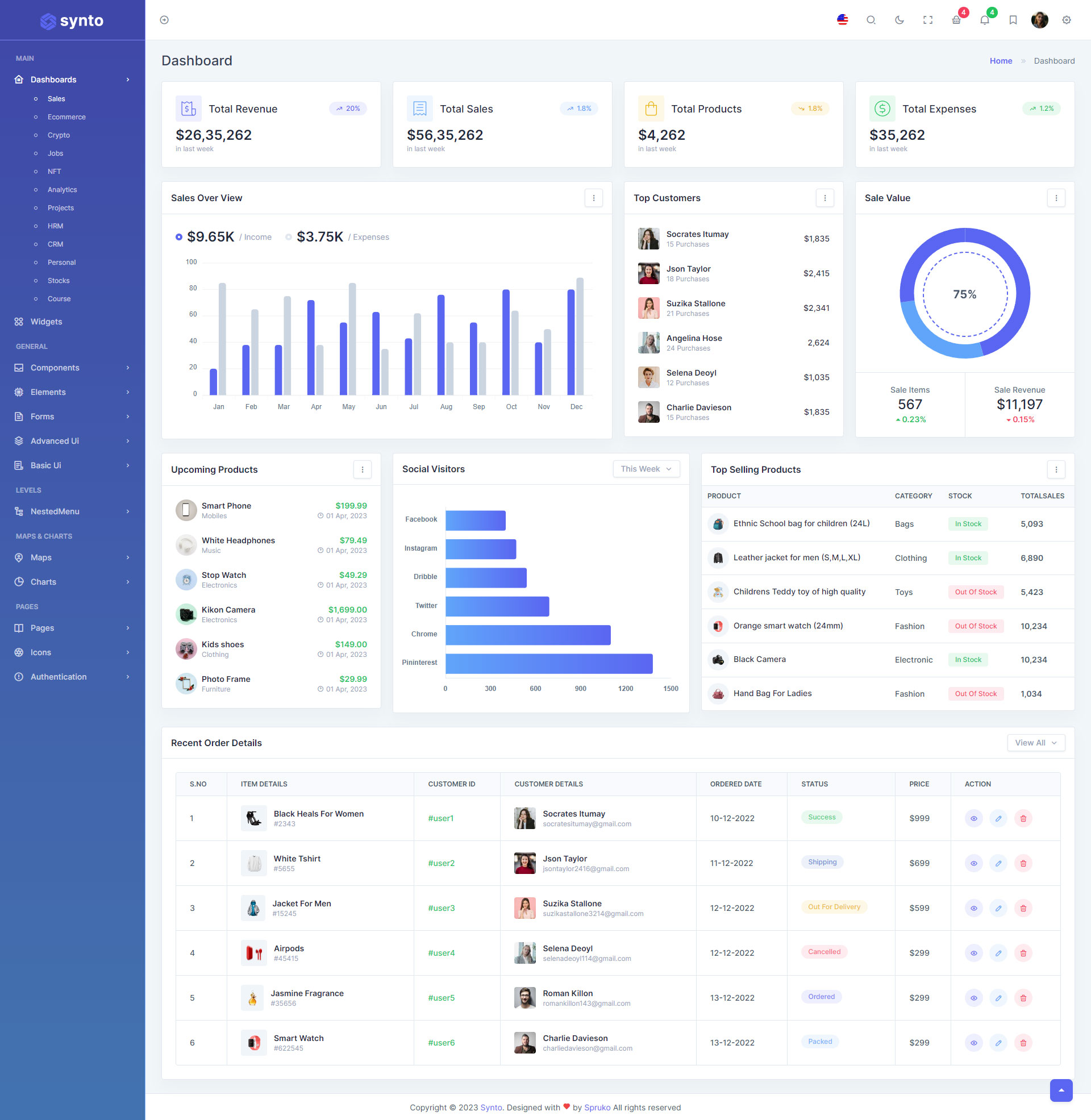 This Synto React TypeScript Admin template comes with 12 beautiful dashboards and different types of themes. So that users can choose their best theme and customize according to their choice.