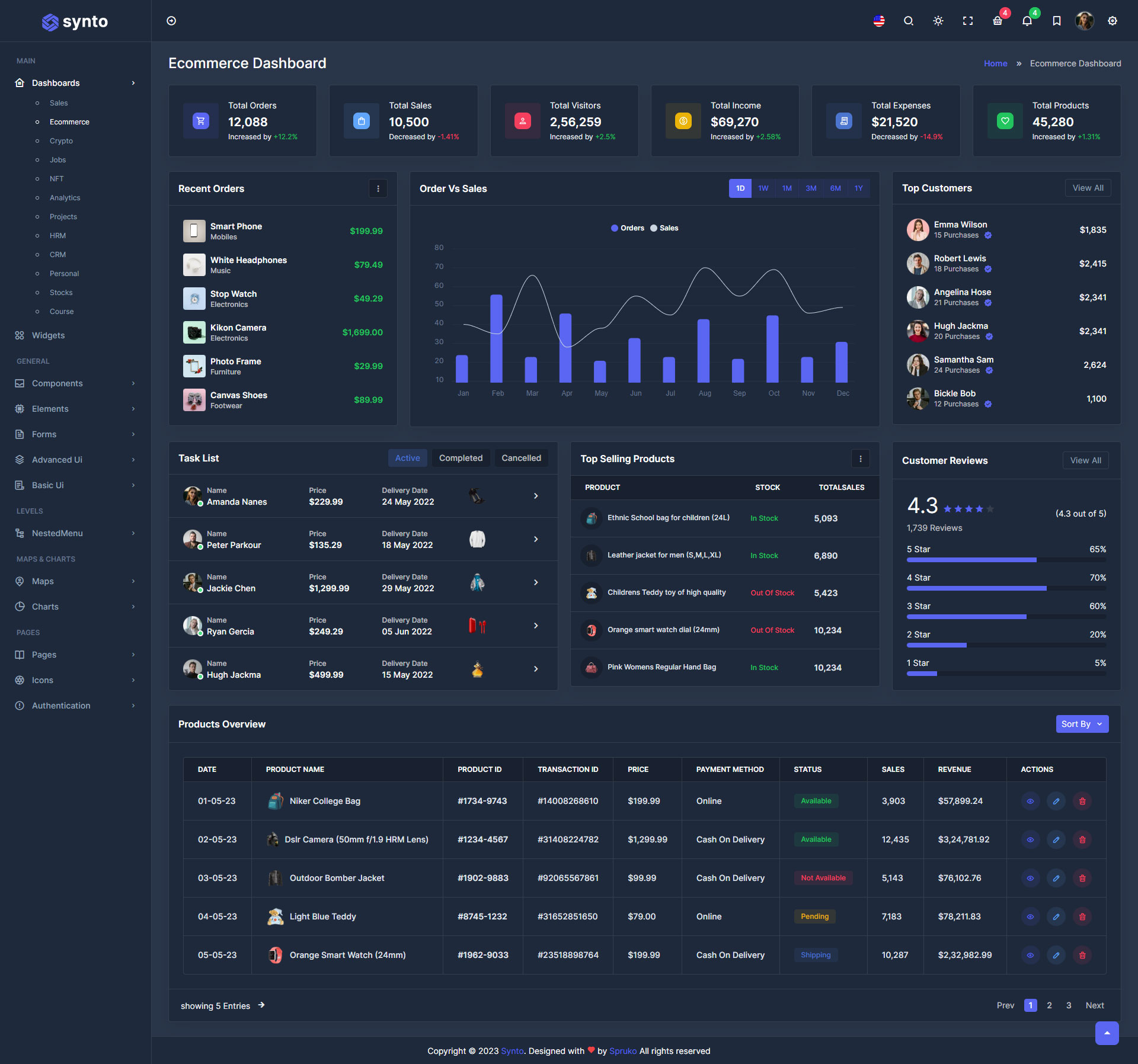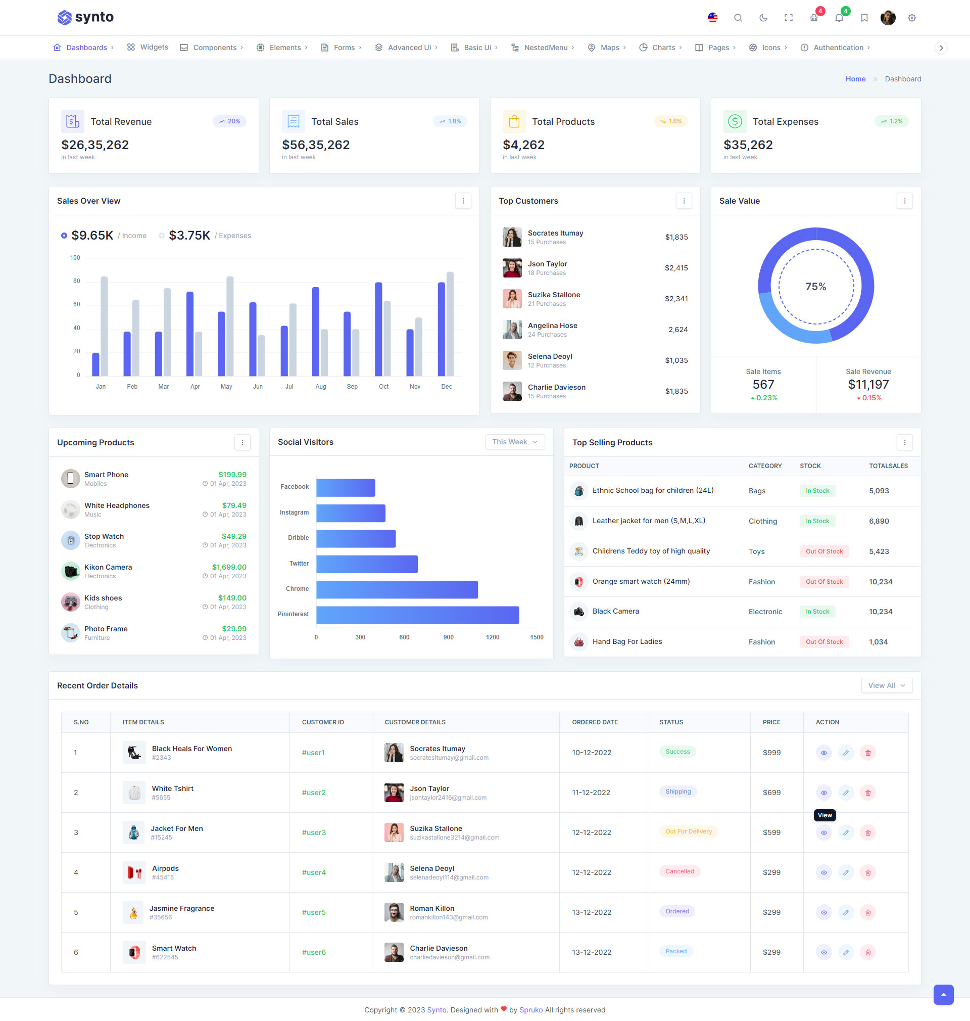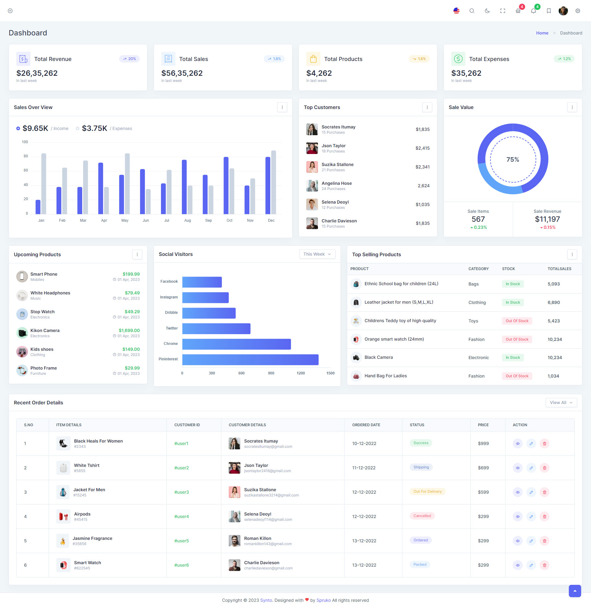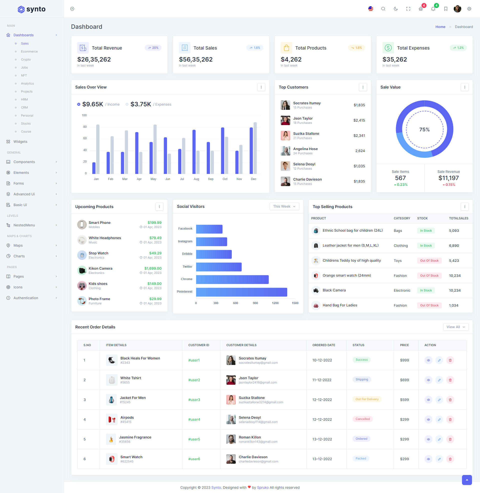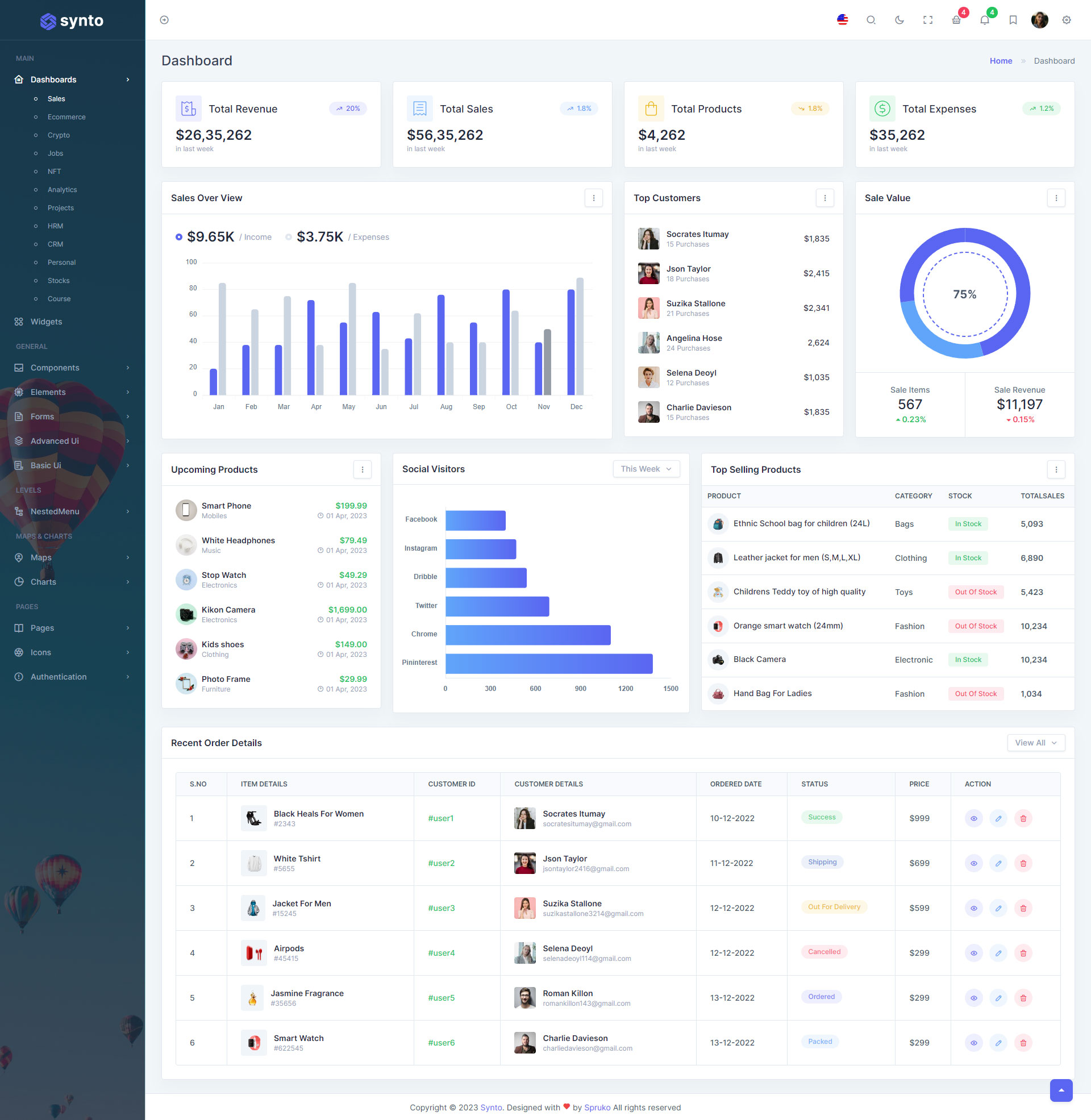 This Synto React TypeScript Admin template comes with 12 beautiful dashboards and different types of themes. So that users can choose their best theme and customize according to their choice.