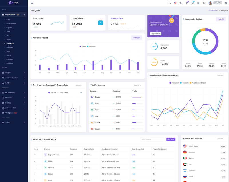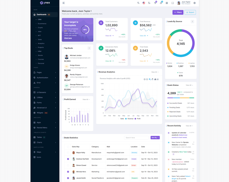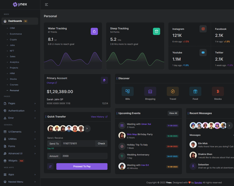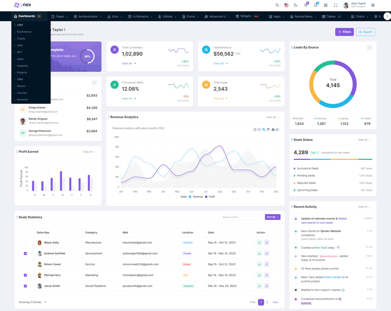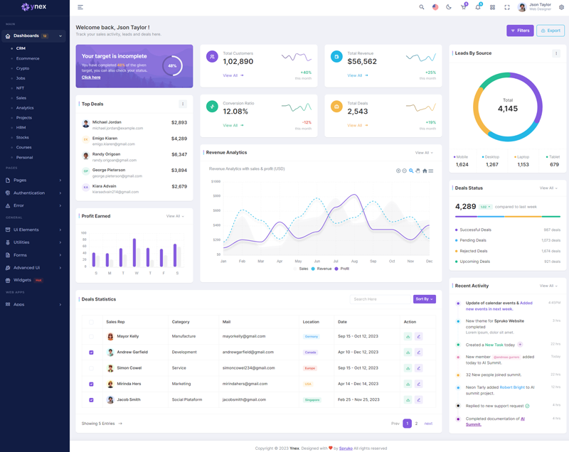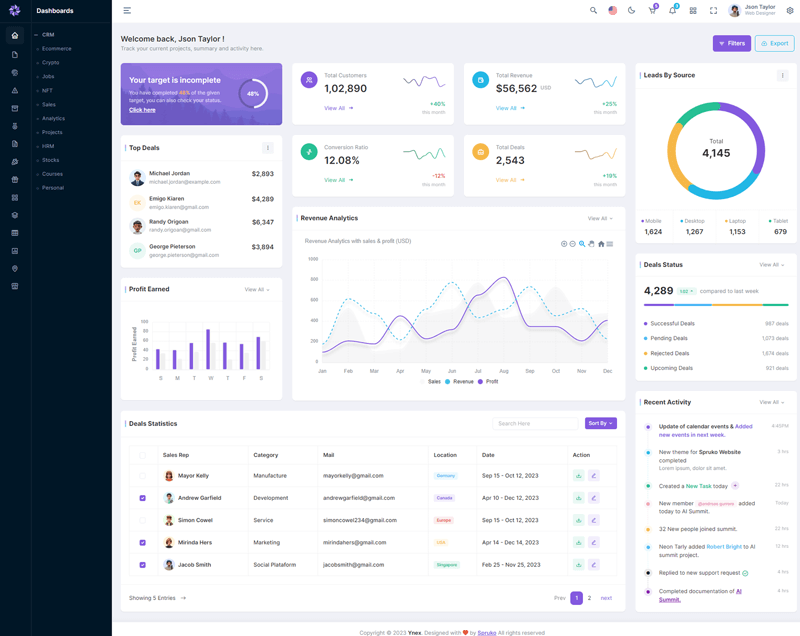 Here, Ynex 12 beautiful dashboards and comes with different types of themes. So that users can choose their best theme and customize the Ynex React Javascript Admin Template according to their choice.