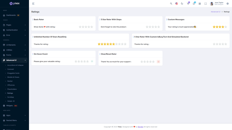 Ynex React Javascript has important features such as the design quality, compatibility with your front-end framework, responsiveness, ease of customization, documentation and support, and additional features such as plugins also integrated.